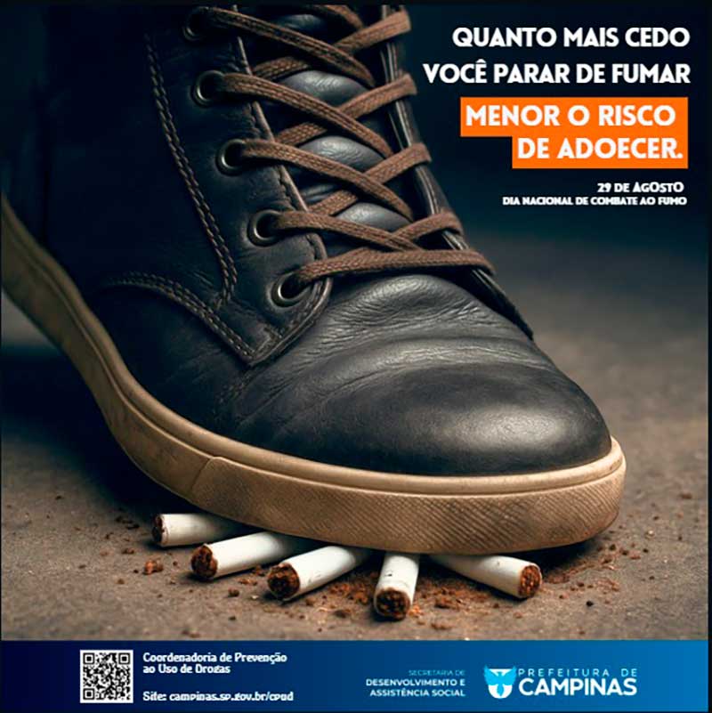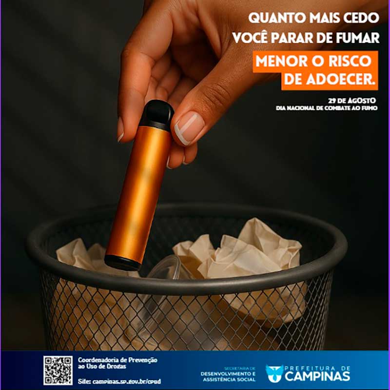 A mobilização será realizada por meio de painéis digitais em pontos de ônibus, redes sociais e ações presenciais nas ruas. Intitulada “Quanto mais cedo parar de fumar, menor o risco de adoecer”, a ação é coordenada pela Secretaria de Desenvolvimento e Assistência Social, por meio da Coordenadoria de Prevenção ao Uso de Drogas.
