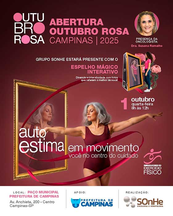 O Grupo SOnHe participa, neste mês de outubro, das principais ações do Outubro Rosa na Região Metropolitana de Campinas (RMC). A abertura oficial da campanha organizada pela Prefeitura de Campinas, no dia 1º de outubro, contará com a presença do grupo, que levará o Espelho Mágico Interativo ao Paço Municipal. A proposta é estimular as mulheres a se olharem, se conhecerem, se amarem e buscarem ajuda sempre que perceberem algo diferente em seu corpo. A ferramenta, que possibilita a realização de fotos interativas, reforçando a autoestima e o protagonismo feminino no cuidado com a saúde, também estará presente na Praça da Juventude, em Campinas, e na Estação Maria Fumaça, em Jaguariúna, com a presença de oncologistas do Grupo SOnHe para o esclarecimento de dúvidas. Como parte das ações, também está prevista uma caminhada e uma roda de conversa na Câmara Municipal de Campinas, com o tema: “Câncer de mama: prevenção, diagnóstico, cirurgia e tratamento”.