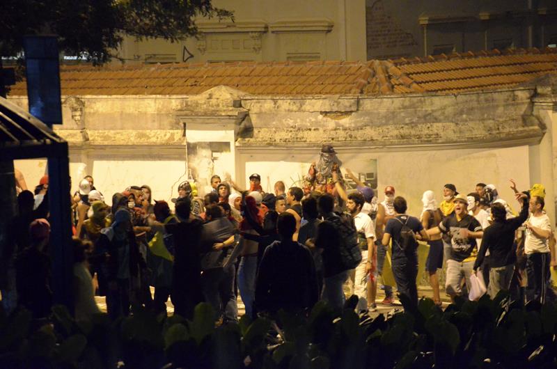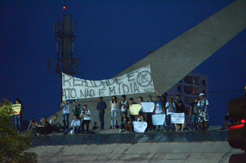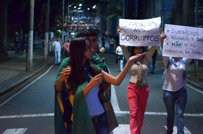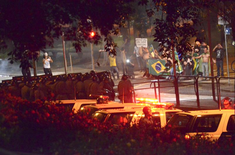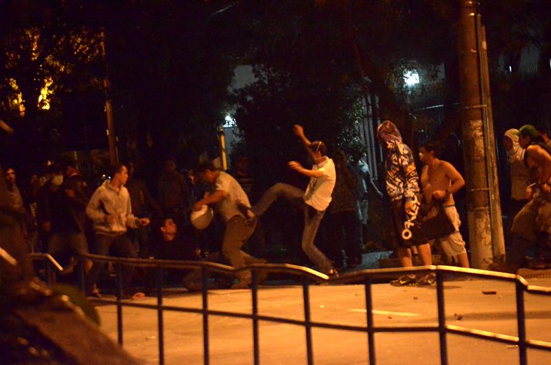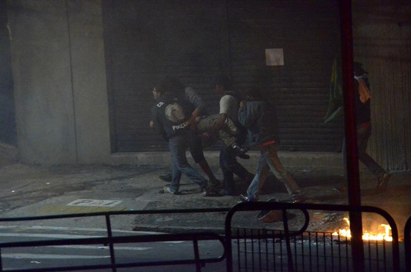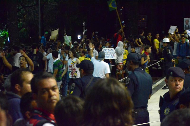 Tudo ia bem até a chegado ao Paço Municipal, onde alguns baderneiros começaram a atirar bombas caseiras e pedras. A Guarda Municipal acuada começou a lançar spray de pimenta, alguns manifestantes do bem e jornalistas que estavam próximos também foram atingidos.